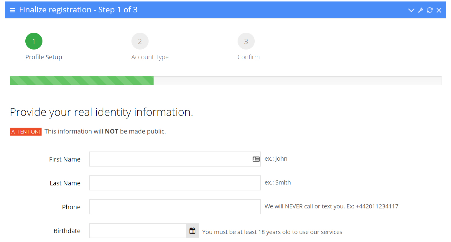 Fill in all the details about your real identity. This information will NOT be made public! Click on “Continue” button.