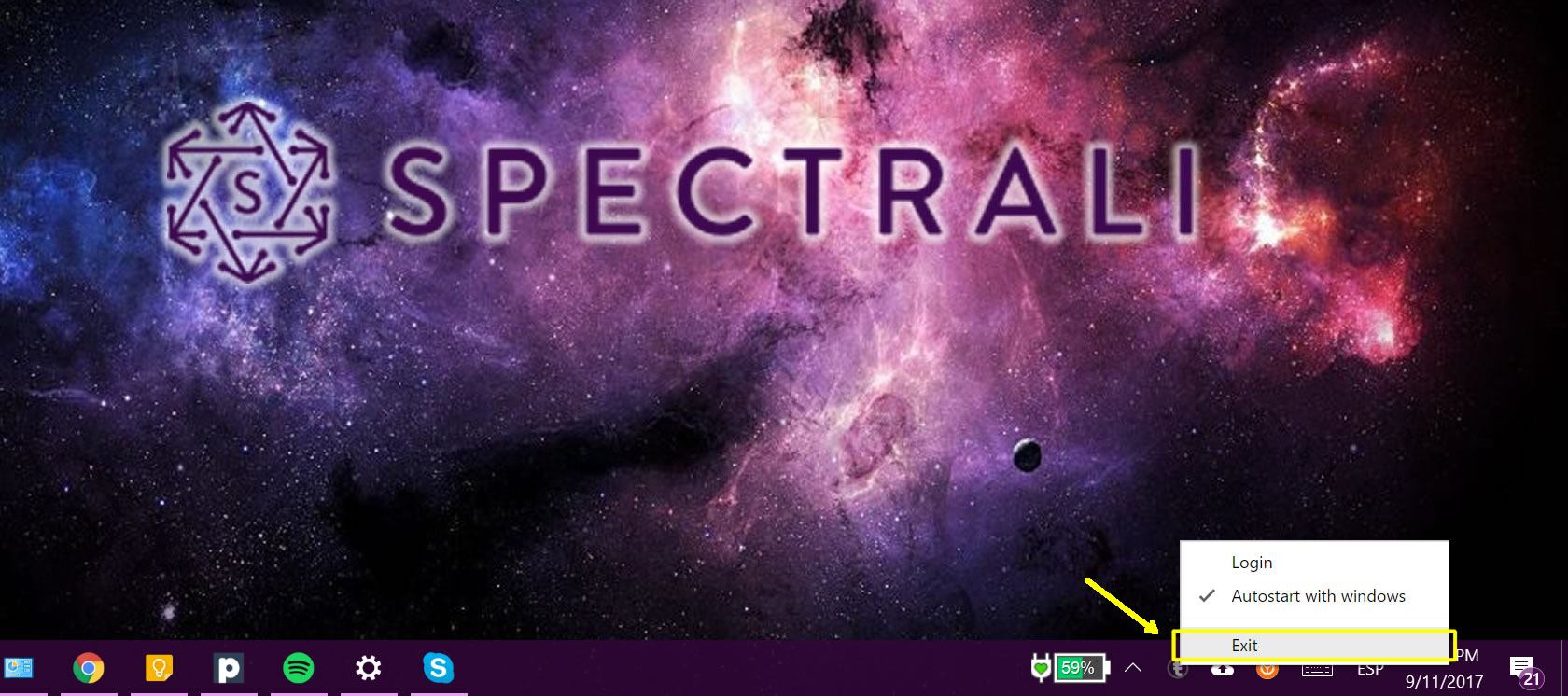 If your plugin is not active, you need to exit like in the print screen below and follow these steps to allow Skype to use the Spectrali plugin: