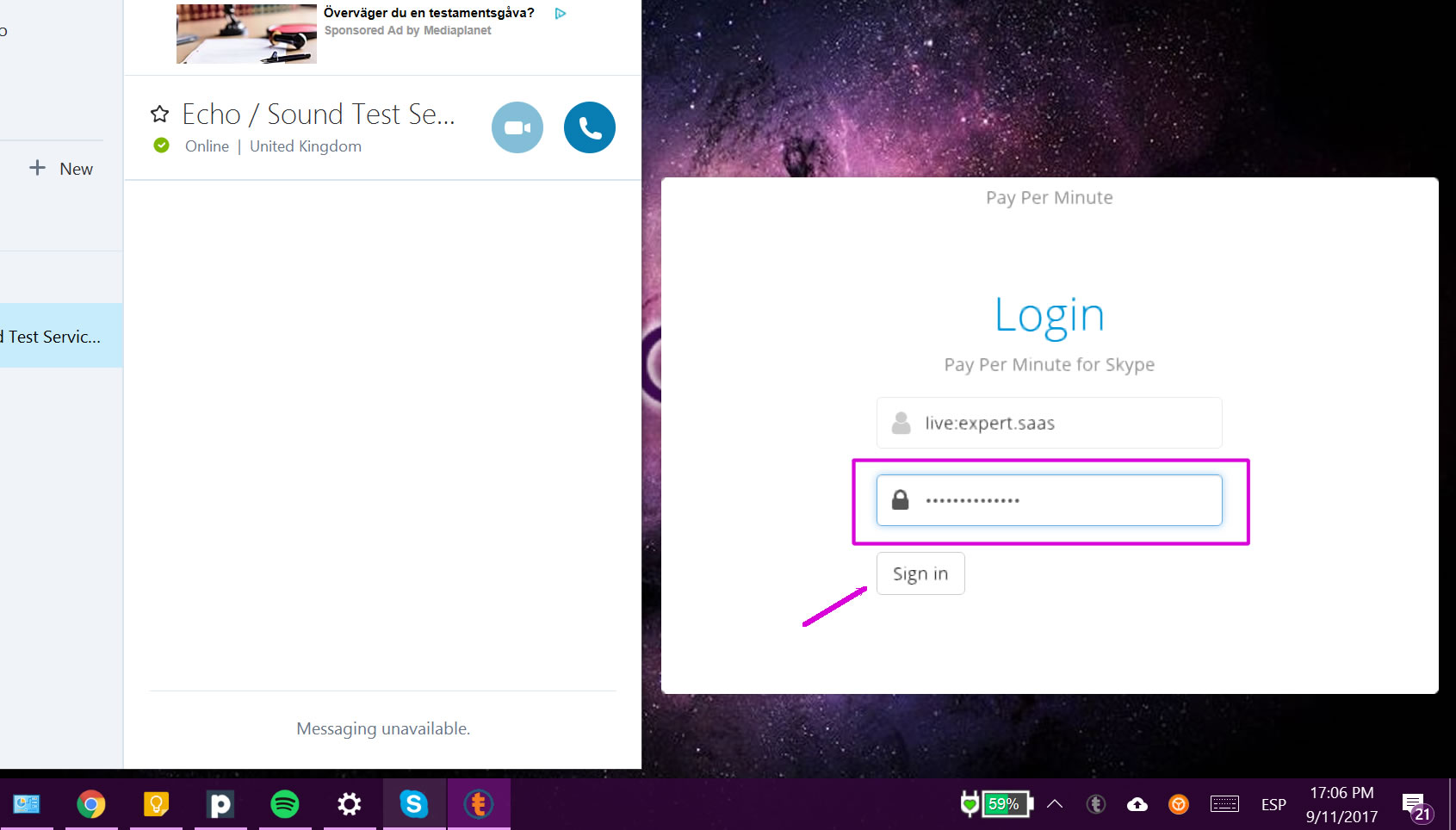Open the Skype plugin and type your password (note that you have to type the Spectrali password, not the Skype one).