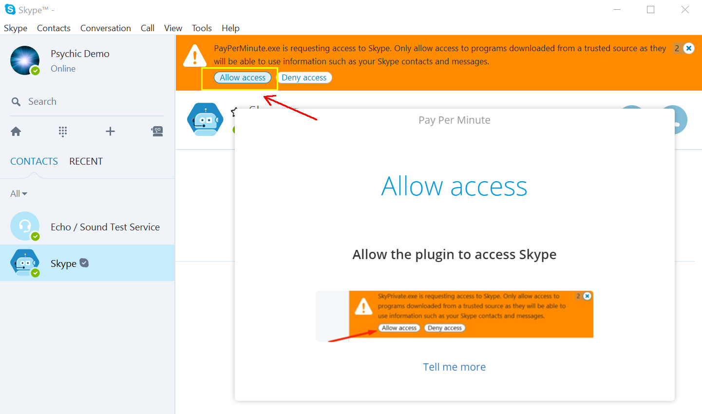 After installing the plugin, a new message will appear in your Skype window. Click on “Allow access”.