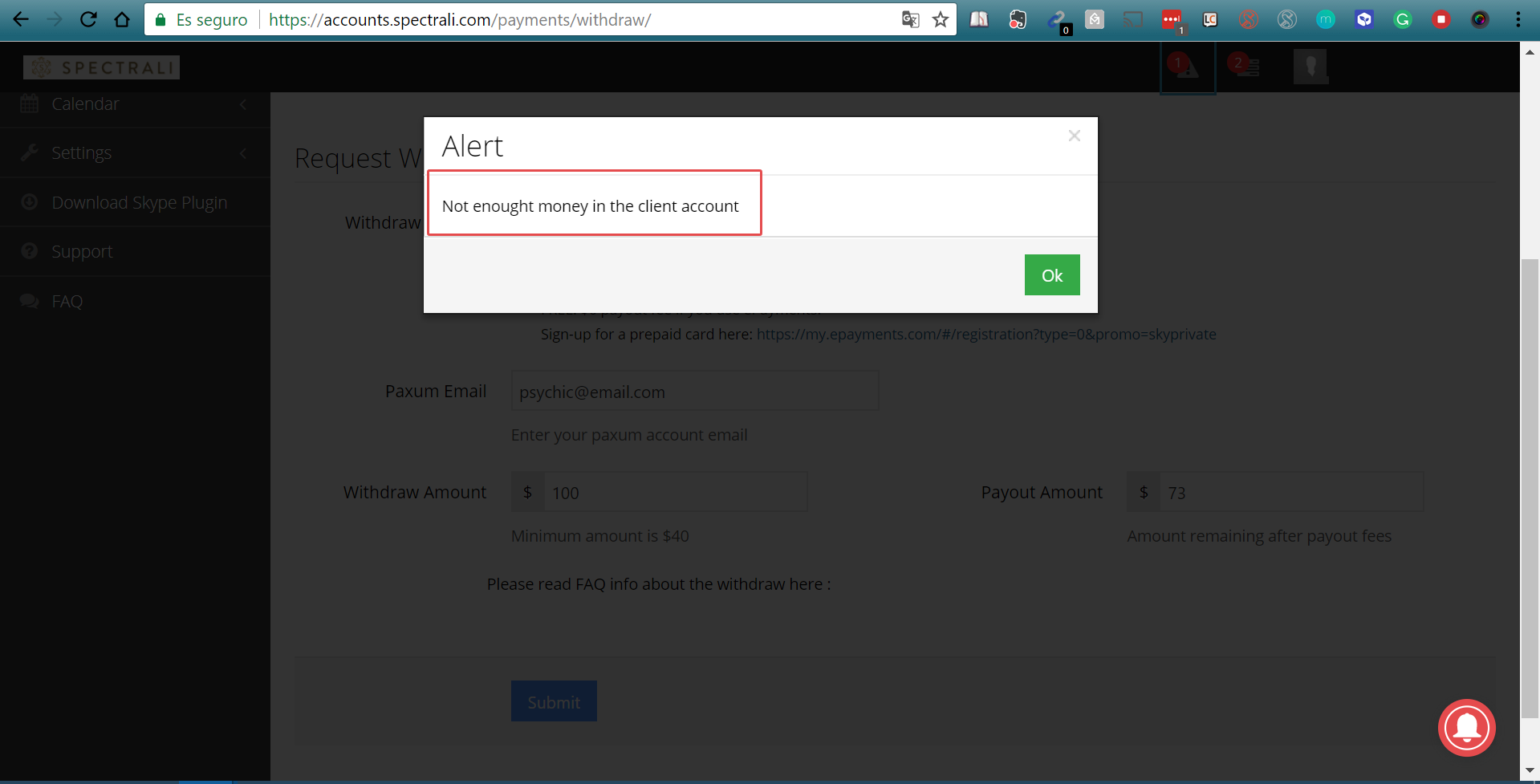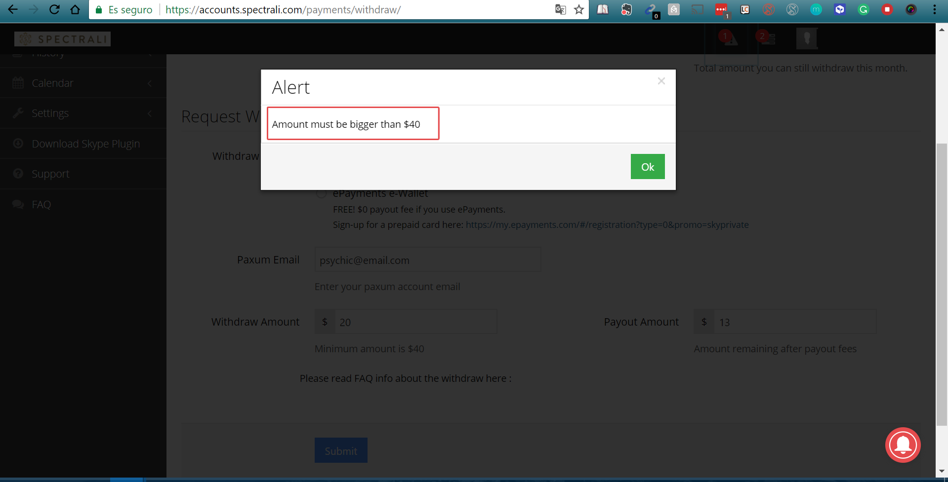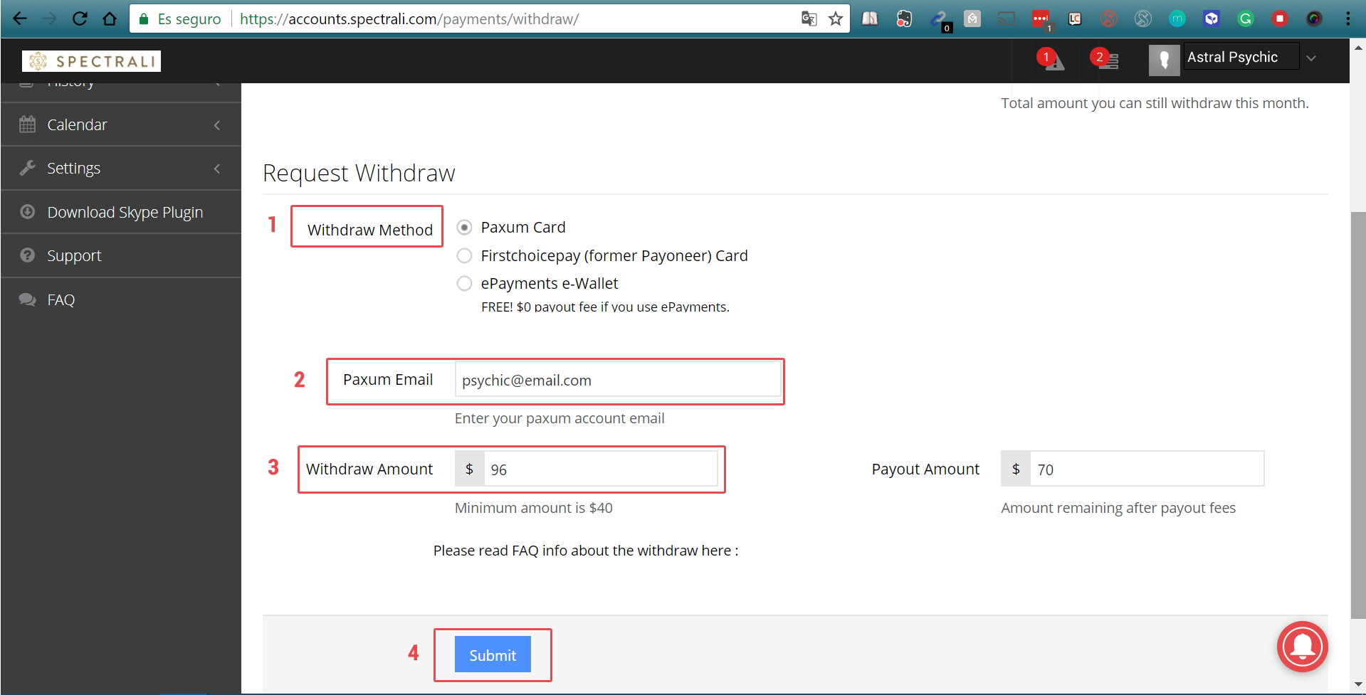 Choose the withdraw method, enter the e-mail address associated with your Paxum or Payoneer. Enter the amount you want to withdraw and then click “Submit”.