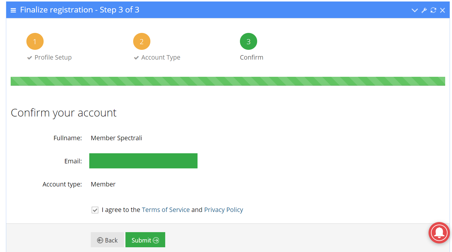 Check “I agree to the Terms of Service and Privacy Policy” and click on “Submit” button.