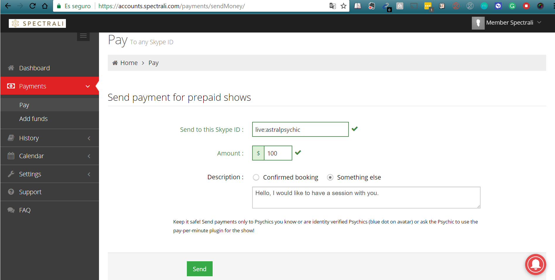 If you have enough funds and the Skype ID you enter is registered on Spectrali, he will instantly receive your money and will receive an e-mail, confirming the transaction.