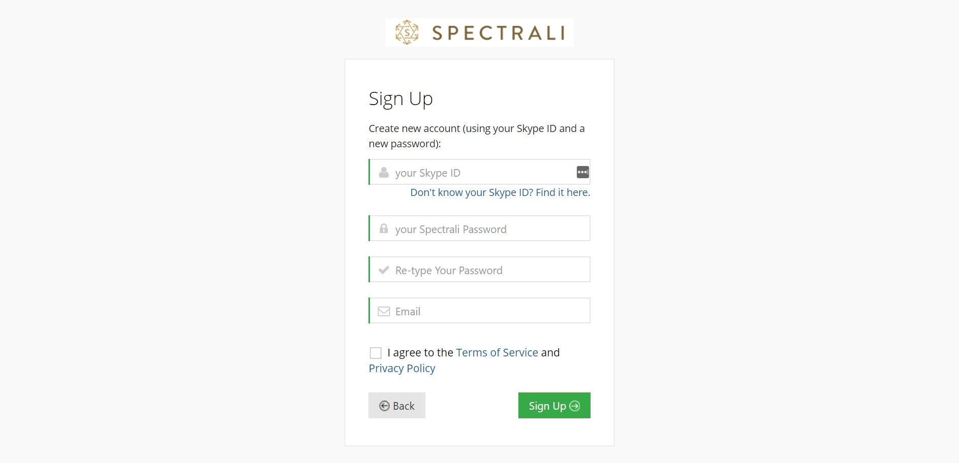 Login to Spectrali.com using your Skype ID and the password you chose. If you don’t have an account, see how you can create one in the first tab.